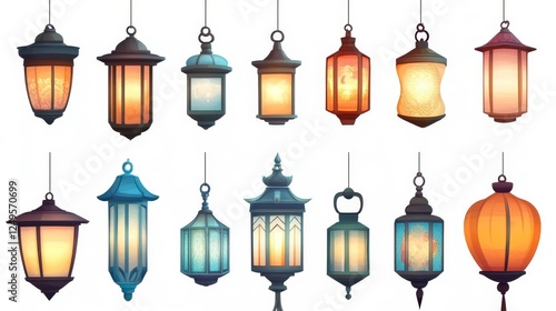 Hanging lanterns illuminated in various styles showcasing decorative elements and warm light