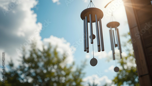 wind, chime, hanging, metal, tube, cylinder, sounding, dangling, sky, blue, sunny, cloud, daytime, backyard, garden, relaxation, calm, peaceful, tranquil, ambient, sound, musical, instrument, nature, light, sunshine, clear, weather, summer, spring, decoration, decor, design, view, horizontal, closeup, still, life, exterior, no, person