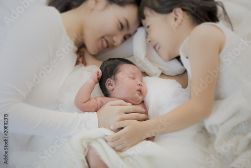 family, bed, mother, baby, children, happy, boy, woman, love, people, bedchamber, young, white, lying, couple, father, happiness, portrait, home, smiling, mother, sleep, lifestyle, fun, smile