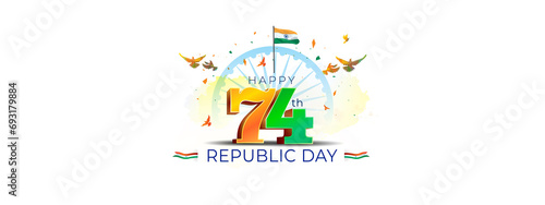 Happy 74th republic day of India 3d Poster design. 26 January 2024 freedom celebration background. Tricolor flag with ashoka chakra illustration.