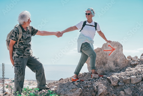 Happy active senior couple on outdoor hike in mountains helping each other up enjoying freedom and healthy lifestyle. Vacation or retirement. Horizon over water background