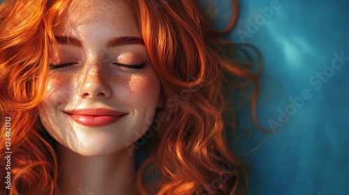 happy, woman, smiling, red hair, blue, background, portrait, cheerful, beauty, positive, joy, female, vibrant, joyful, confidence, redhead, expression, face, happy woman, smiling woman, bright, colours, fashion, relaxed, carefree, blue background, smiling face