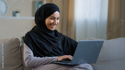Happy arab woman muslim young girl woman freelancer creator in hijab sit at home chatting with friend on computer texting email work online search job vacancy in internet develop web design e-commerce