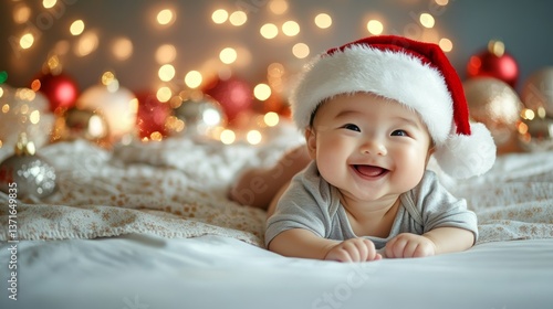 precious, innocence, ornament, gathering, infant, memory, newborn, toddler, joyful, eve, idylli, merry, glow, dream, light, christmas, bokeh, festive, smile, party, lying, december, cosy, adorable, happiness, bed, fun, family, gift, happy, children, portrait, santa, baby, white, red, cute, childhood, cheerful, holiday, celebration, decoration, christmas, bright, season, background, asian, beautiful