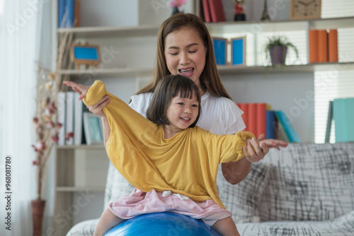 Happy Asian child having fun with fitness ball, doing exercises with mother at home