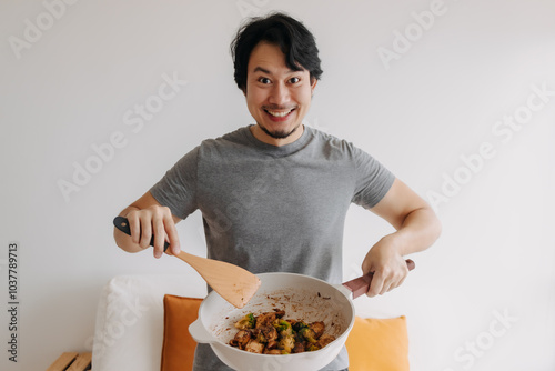Happy asian man proud and present his homemade meal in the pan.