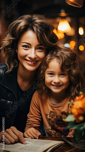 Happy asian mother and daughter sitting at table and doing homework. People portrait illustration. Generative AI