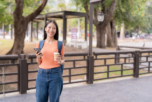 Happy Asian student walking through a park, enjoying her takeaway coffee while using her smartphone. Smiling and relaxed, she embodies the vibrant spirit of modern urban life