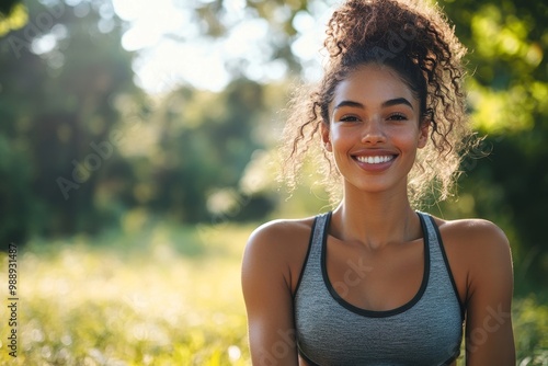 Happy athletic woman relaxing after exercising in park, Generative AI