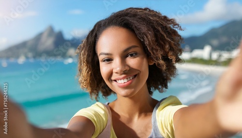 Happy attractive tanned woman making selfie and smile to camera on amazing sea view