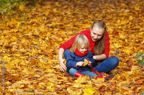 Happy autumn. A mother and daughter are playing and laughing in an autumn park.