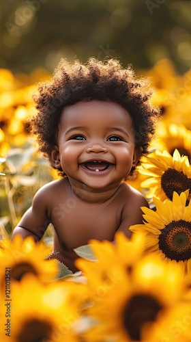baby, happy, smiling, cheerful, joyful, cute, adorable, infant, toddler, children, sunflower, field, flower, yellow, bright, summer, sunlight, sunshine, warm, gold, flower petals, bloom, blossoming, nature, portrait, photo, image, picture, beautiful, innocence, purity, carefree, healthy, vibrant, lively, delight, joy, gladness, gleeful, glee, fun, african, american, dark, skin
