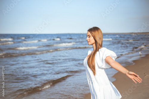 Happy, beautiful woman on the ocean beach standing in a white summer dress, open arms