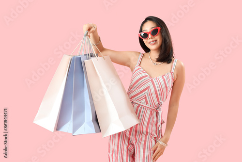 Happy beautiful young Asian woman in sunglasses with shopping bags on pink background