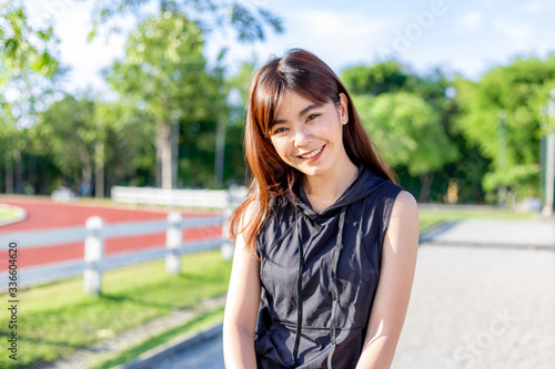 Happy beautiful young Asian woman smiling happily at camera during her exercise break