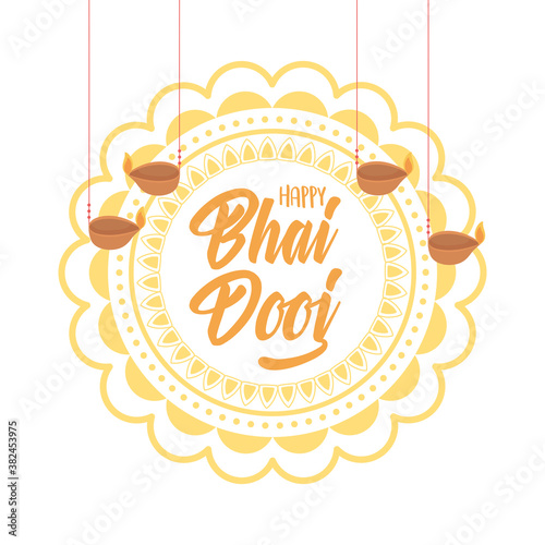 happy bhai dooj, indian family celebration floral mandala and hanging diya lamps