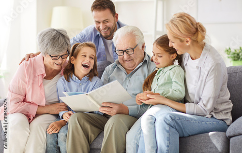 Happy big family, gathering at home on sofa, laughing three generations got printed album, viewing funny family life moments, enjoy photos remembering, photobook, parents, grandparents, children fun