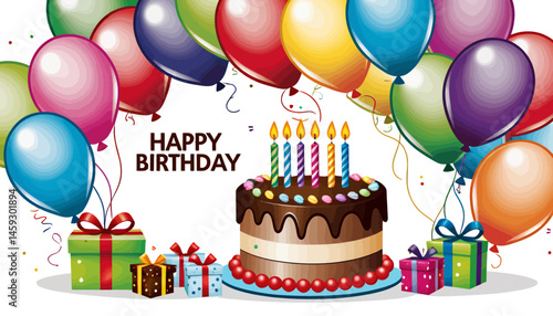 Happy Birthday Cake Balloons and Gifts_Celebration Image_Party Supplies_Birthday Decorations_Festive Birthday_Colorful Balloons_Birthday Wishes and Present Ideas