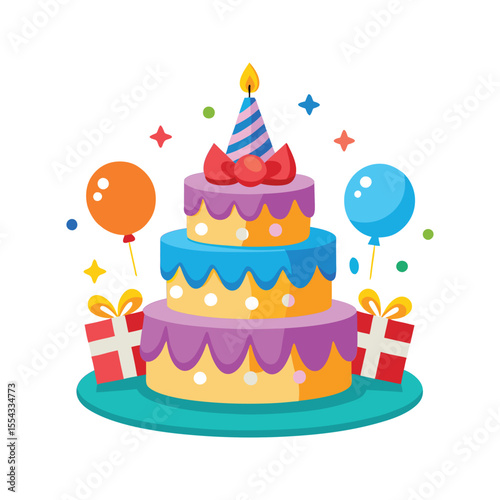 Happy birthday cake with candles, balloons, and stars decorations vector illustration isolated on white background