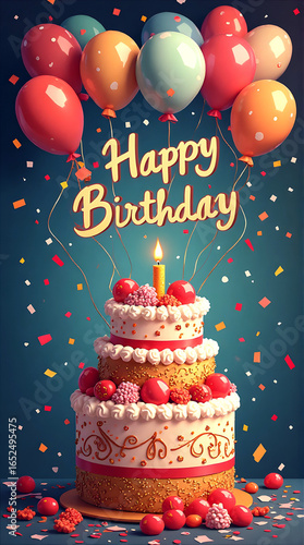 Happy birthday card with cake and colorful balloons on blue background