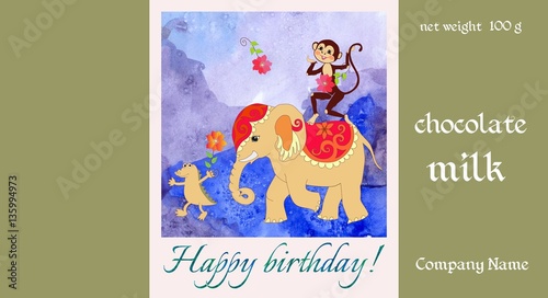 Happy birthday. Chocolate packaging with cute monkey, elephant and small crocodile on watercolor background. Cartoon illustration - 1.