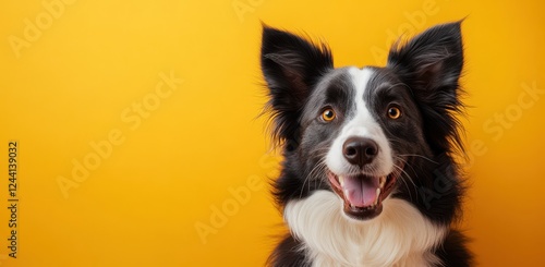 Happy black and white border collie dog with bright yellow background, showcasing joyful expression and playful personality in a vibrant atmosphere
