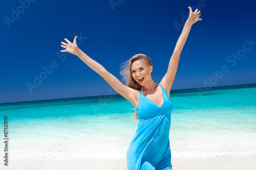 Happy blond girl on beach, feeling freedom.
