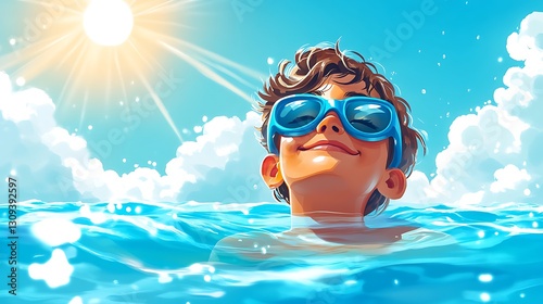 boy, swimming, ocean, summer, sunny, happy, fun, sun, day, water, children, children, beach, sea, blue, sky, cloud, joyful, smile, cheerful, vacation, holiday, travel, carefree, relaxation, tropical, playful, energy, childhood, adventure, freedom, joy, young, cute, adorable, innocent, healthy, lifestyle, portrait, illustration, digital, art, bright, positive, family