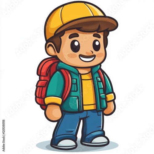 boy, happy, backpack, travel, adventure, journey, explorer, young, children, children, cartoon, illustration, character, design, cute, smiling, cheerful, friendly, positive, optimistic, outdoors, nature, hiking, camping, trekking, climbing, mountain, forest, wood, landscape, scenic, view, scenery, path, trail, route, destination, exploration, discovery, wanderlust, freedom, fun, exciting, vibrant, colours, yellow, red, green