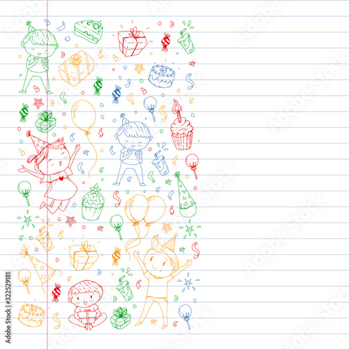 Happy boys and girls. Little kindergarten preschool children. Birthday party celebration. Icons for banners, posters, invitation.