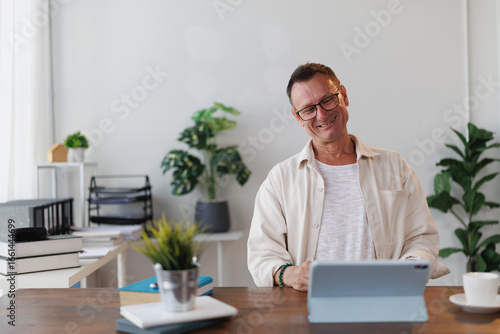 businessman, home, office, tablet, working, smiling, happy, entrepreneur, mature, online, communication, electronic mail, video, desk, book, hot drink, remote, cosy, relaxing, break, technology, cyberspace, connection, wireless, freelance, job, work, from, workplace, comfortable, casual attire, lifestyle, business, success, achievement, modern, interior, house, plant, domestic, indoor, 1, person, adult, man, senior, middle, aged, portrait
