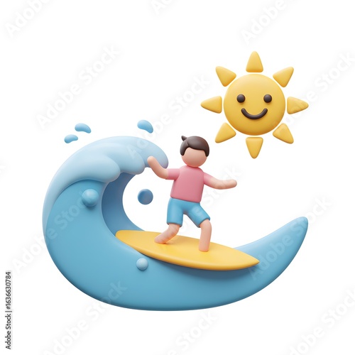 cartoon, vector, surfer, sport, surfing, wave, sun, bright, happy, character, summer, fun, water, sport, beach, ocean, sea, activity, recreation, leisure, vacation, holiday, adventure, tropical, coastal, marin, aquatic, lifestyle, healthy, fitness, joy, happiness, illustration, three-dimensional, render, digital, art, playful, energetic, exciting, refreshing, seasonal, yellow, blue