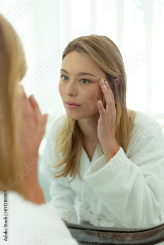 Happy caucasian woman in bathrobe looking in mirror and touching face in sunny bathroom