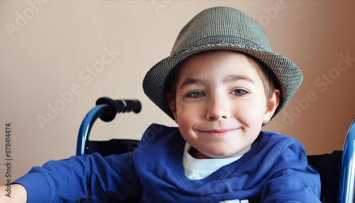 Happy Child in Wheelchair on City Street, Modern Urban Background, Inclusive Community, Background, Greeting Card
