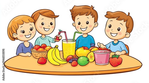children, children, happy, smiling, friends, fruit, juice, smoothie, healthy, eating, food, drink, table, together, fun, meal, breakfast, snack, lifestyle, childhood, nourishment, delicious, sweet, fresh, colourful, vibrant, playful, adorable, cute, young, group, family, picnic, party, summer, spring, joy, togetherness, well-being, nourishment, vitamin