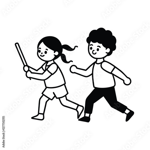 children, playing, tags, game, running, stick, joyful, playful, active, outdoors, childhood, fun, girl, boy, children, friends, friendship, happy, smiling, chase, sport, activity, illustration, drawing, black, white, simple, cartoon, cute, adorable, vector, graphic, design, playtime, toddler, preschool, elementary, school, summer, park, playground, energy, movement, healthy, lifestyle, childlike