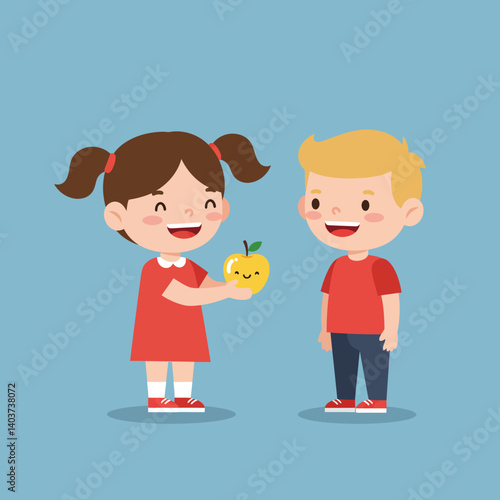 children, children, girl, boy, apple, fruit, smile, happy, red, colours, flat, design, vector, art, digital, illustration, cute, character, play, joy, friendship, share, gift, simple, fun, cartoon, graphic, cheerful, expression, blue, background, creativity, style, colourful, image, scene, playful, interaction, nature, culture