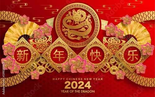 Happy chinese new year 2024 the dragon zodiac sign with flower,lantern,asian elements gold paper cut style on color background. ( Translation : happy new year 2024 year of the dragon )