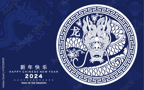 Happy chinese new year 2024 the dragon zodiac sign with flower,lantern,asian elements white and blue paper cut style on color background. ( Translation : happy new year 2024 year of the dragon )