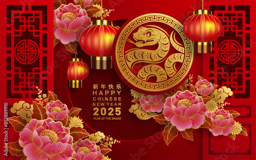 Happy chinese new year 2025 the snake zodiac sign with flower,lantern,asian elements snake logo red and gold paper cut style on color background. ( Translation : happy new year 2025 year of the snake