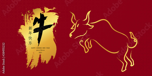Happy chinese new year banner card year of Ox. red vector graphic and background Calligraphy translation year of the brings prosperity :Chinese calendar for the year of ox 2021,