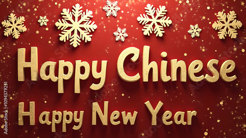 Happy Chinese New Year Greeting with Gold 3D Text and Snowflakes