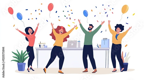 celebration, party, success, achievement, teamwork, colleague, office, confetti, balloon, happy, joyful, excited, fun, friendship, togetherness, group, people, woman, man, diverse, diversity, workplace, business, career, job, professional, accomplishment, victory, succeed, goal, target, motivation, inspiration, happiness, joy, excitement, energy, positive, upbeat, smiling, laughing, festive, colourful, vibrant, dynamic, modern, stylish, design, illustration
