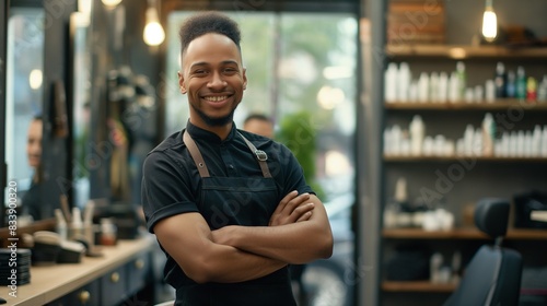 Happy confident stylish handsome black young male barber standing arm crossed in his modern barber shop, portrait of small business owner.