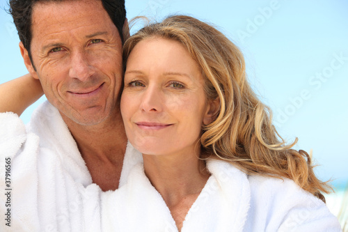 man, woman, happy, smiling, couple, partner, husband, wife, outside, outdoors, blue, sky, spa, holiday, vacation, break, rest, relaxing, hug, cuddle, love, human relationships, affection, wearing, dressing, gown, bathe, robe, caucasian, white, dark, brown, fair, long, blond, hair, health, well-being, happiness, landscape, closeup, calm, care, devotion, endearment, cheerfulness, well-being