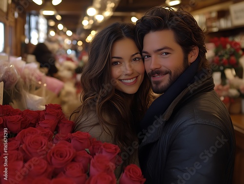 love, couple, romance, flower, rose, red, market, valentine, happy, smile, beautiful, attractive, man, woman, human relationships, affection, intimacy, date, floristry, bouquet, floral, flower petals, romantic, together, hugs, portrait, joy, passion, affectionate, tender, charming, photogenic, gorgeous, stylish, winter, indoor, close, up, view