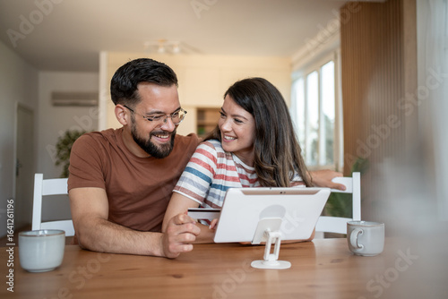 online shopping, credit card, tablet, couple, home, technology, cyberspace, buying, purchase, e-business, digital, happy, smiling, man, woman, husband, wife, togetherness, lifestyle, modern, indoor, domestic life, connection, communication, banking, finance, transaction, secure, datum, retail, consumerism, spending, comfortable