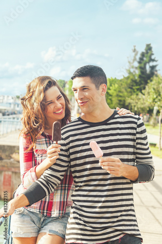 beautiful, black hair, boyfriend, caucasian, cheerful, couple, day, enjoying, girl, girlfriend, guy, photogenic, happy, hispanic, hot pants, ice cream, laughing, love, man, modern, outdoors, park, red hair, human relationships, river, romantic, sky, smiling, stick, stripes, summer, sunny, tree, walk, woman, young