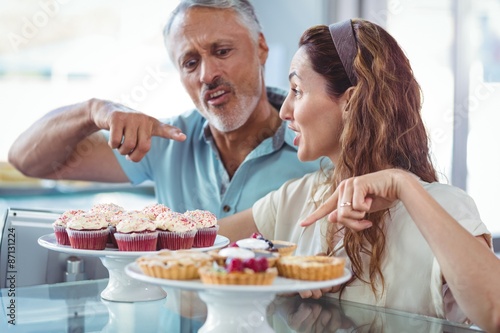 woman, female, caucasian, mature adult, man, male, cafes, attractive, standing, cafes, cafeteria, pretty, fresh, delicious, bakery, cafes, client, leisure, lifestyle, relaxing, time off, happy, smiling, bear, cheerful, photogenic, pastry, portrait, brunette, brown hair, long hair, grey hair, gesture, signs, pointing