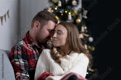 Happy couple sitting near decorated christmas tree